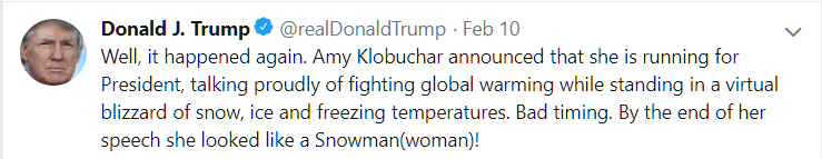 I could do a whole hour explaining the difference between climate and weather and how Trump just cannot see the difference. We already know he melts in the rain and can’t operate an umbrella. So instead we’ll just let him play the ignorance card again and move on to Klobuchar’s classic response: