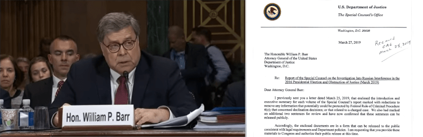 The night before Attorney General William Barr was to testify before the Senate Judiciary Committee, the Washington Post first reported that Special Counsel Robert Mueller had, on March 27th, 2019, sent a letter to Barr characterizing Barr’s four page memo to Congress, dated March 24,