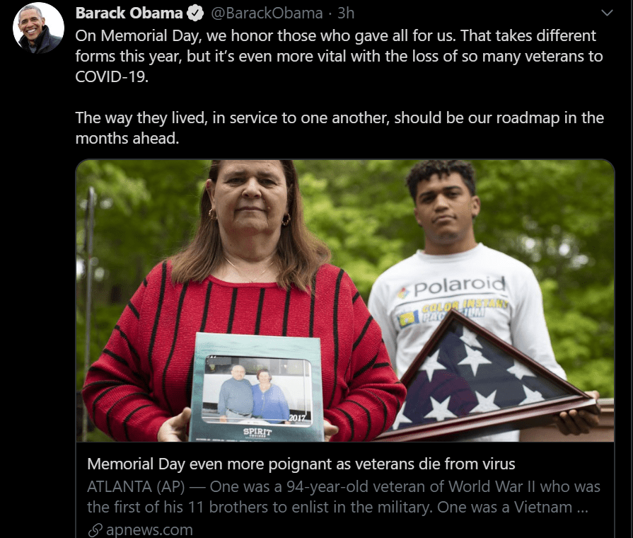 Contrast that with the message from our previous president, commenorating Memorial Day 2020: