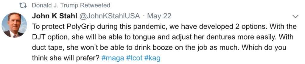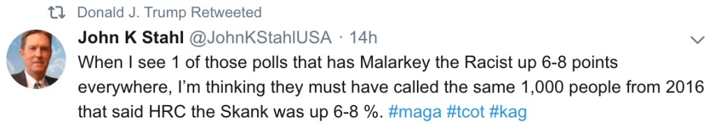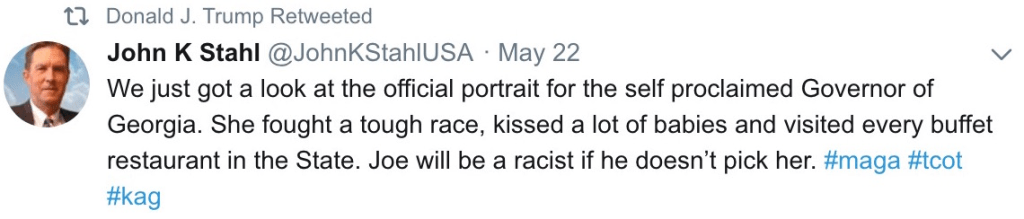 Even worse then this holiday weekend’s series of direct tweets by Trump are the tweets of others retweeted by Trump. When you retweet, you pass along a message you came across to your followers. Trump has a history of retweeting some of the most inflammatory, vile, and crude screeds in this fashion. This weekend he passed along eight tweets from John K. Stahl, a failed Republican candidate for Congress from California.
