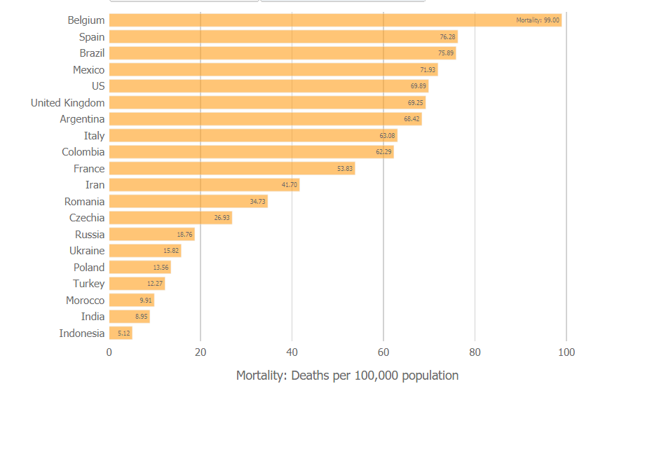 The chart is is a good way to compare the U.S. Covid response to the response of other countries. Deaths per capita adjusts for the difference in population. And death, rather than cases or positive tests, moves us away from the issue of how many tests are being done and gets to the bottom line. The U.S. is not the worst. But it is far from the best, as Trump repeatedly boasts. Think about it. And remember Trump is giving himself a perfect score for his handling of this crisis.