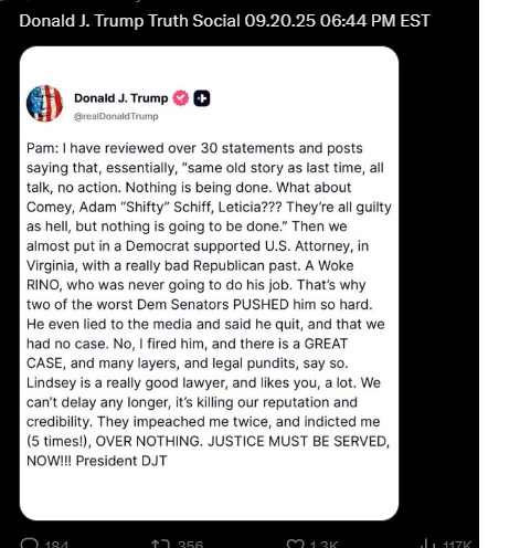In his post, Trump charges, tries, and convicts Comey. And he does the same to Senator Adam Schiff and New York Attorney General Letitia James. Here Trump exhorts Pat Bondi, now Attorney General of the United States, to act against the people who “impeached me twice” and “indicted me (5 times).” There is also a reference that complains, “we almost put in a Democrat supported U.S. Attorney, in Virginia…. I fired him…. Lindsey is a really good lawyer, and likes you, a lot. We can’t delay any longer….”